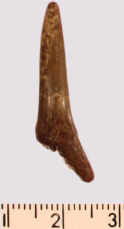 Зуб. Акула. Scapanorhynchus gigas Woodward, 1889. Классификация: Хордовые Chordata, Позвоночные Vertebrata, Хрящевые рыбы Chondrichthyes, Пластиножаберные Elasmobranchii