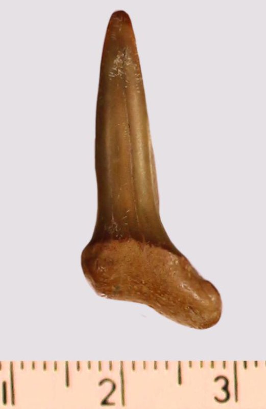 Зуб. Акула. Scapanorhynchus gigas Woodward, 1889. Классификация: Хордовые Chordata, Позвоночные Vertebrata, Хрящевые рыбы Chondrichthyes, Пластиножаберные Elasmobranchii
