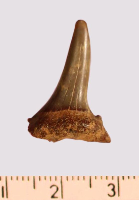 Зуб. Акула. Scapanorhynchus gigas Woodward, 1889. Классификация: Хордовые Chordata, Позвоночные Vertebrata, Хрящевые рыбы Chondrichthyes, Пластиножаберные Elasmobranchii