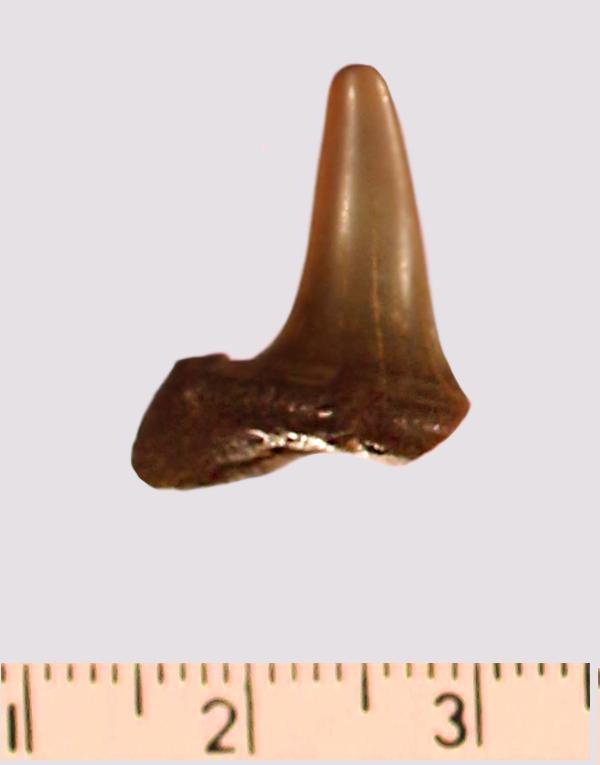 Зуб. Акула. Scapanorhynchus gigas Woodward, 1889. Классификация: Хордовые Chordata, Позвоночные Vertebrata, Хрящевые рыбы Chondrichthyes, Пластиножаберные Elasmobranchii
