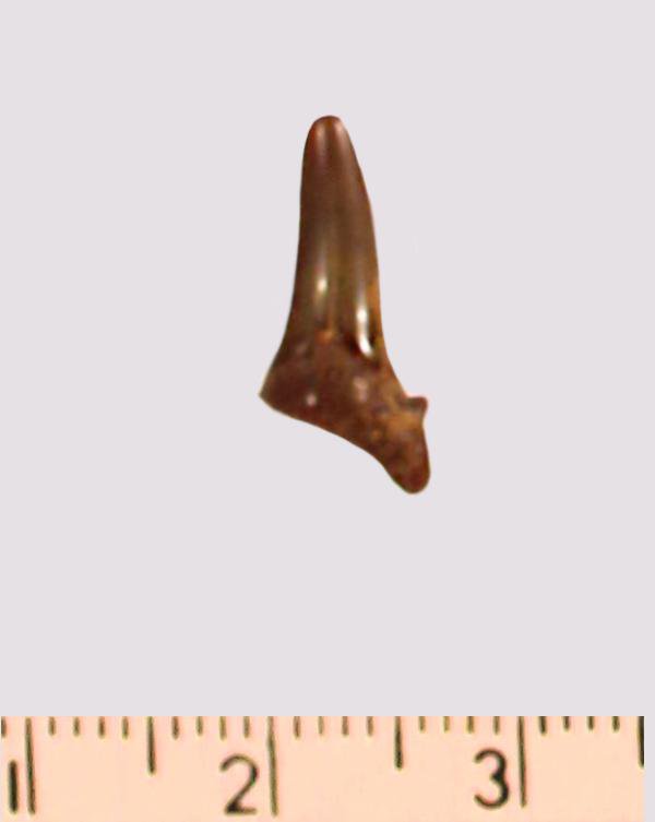 Зуб. Акула. Scapanorhynchus gigas Woodward, 1889. Классификация: Хордовые Chordata, Позвоночные Vertebrata, Хрящевые рыбы Chondrichthyes, Пластиножаберные Elasmobranchii