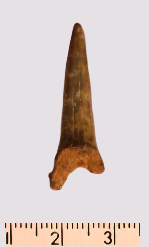 Зуб. Акула. Scapanorhynchus gigas Woodward, 1889. Классификация: Хордовые Chordata, Позвоночные Vertebrata, Хрящевые рыбы Chondrichthyes, Пластиножаберные Elasmobranchii