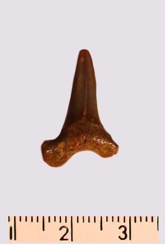 Зуб. Акула. Scapanorhynchus gigas Woodward, 1889. Классификация: Хордовые Chordata, Позвоночные Vertebrata, Хрящевые рыбы Chondrichthyes, Пластиножаберные Elasmobranchii