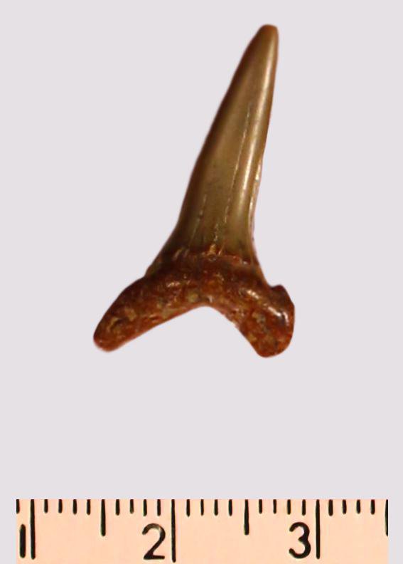 Зуб. Акула. Scapanorhynchus gigas Woodward, 1889. Классификация: Хордовые Chordata, Позвоночные Vertebrata, Хрящевые рыбы Chondrichthyes, Пластиножаберные Elasmobranchii
