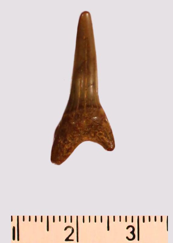 Зуб. Акула. Scapanorhynchus gigas Woodward, 1889. Классификация: Хордовые Chordata, Позвоночные Vertebrata, Хрящевые рыбы Chondrichthyes, Пластиножаберные Elasmobranchii