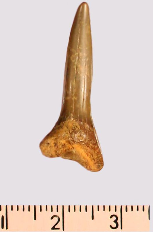 Зуб. Акула. Scapanorhynchus gigas Woodward, 1889. Классификация: Хордовые Chordata, Позвоночные Vertebrata, Хрящевые рыбы Chondrichthyes, Пластиножаберные Elasmobranchii