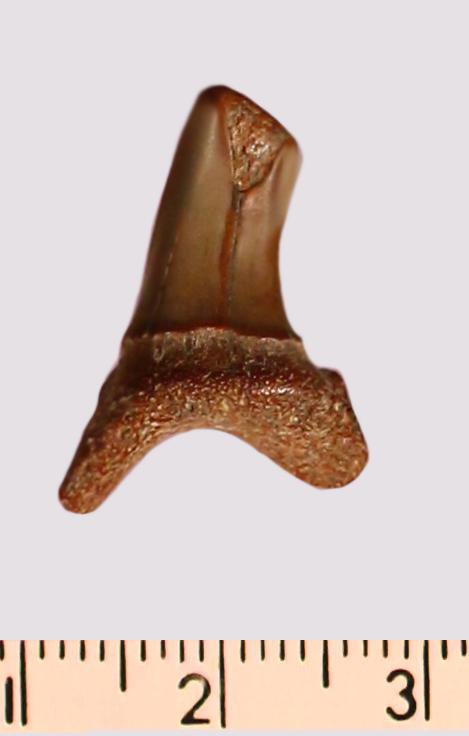 Зуб. Акула. Scapanorhynchus gigas Woodward, 1889. Классификация: Хордовые Chordata, Позвоночные Vertebrata, Хрящевые рыбы Chondrichthyes, Пластиножаберные Elasmobranchii