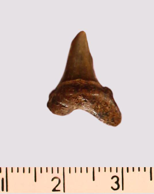 Зуб. Акула. Scapanorhynchus gigas Woodward, 1889. Классификация: Хордовые Chordata, Позвоночные Vertebrata, Хрящевые рыбы Chondrichthyes, Пластиножаберные Elasmobranchii