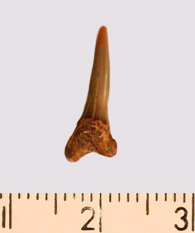 Зуб. Акула. Scapanorhynchus gigas Woodward, 1889. Классификация: Хордовые Chordata, Позвоночные Vertebrata, Хрящевые рыбы Chondrichthyes, Пластиножаберные Elasmobranchii