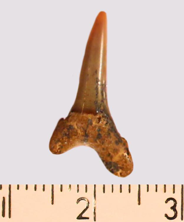 Зуб. Акула. Scapanorhynchus gigas Woodward, 1889. Классификация: Хордовые Chordata, Позвоночные Vertebrata, Хрящевые рыбы Chondrichthyes, Пластиножаберные Elasmobranchii