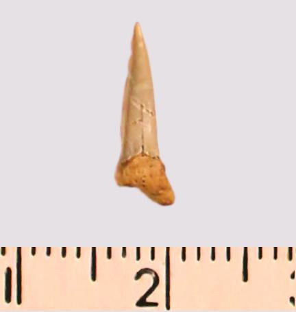 Зуб (фрагмент). Акула. Eostriatolamia subulata (Agassiz, 1843). Классификация: Хордовые Chordata, Позвоночные Vertebrata, Хрящевые рыбы Chondrichthyes, Пластиножаберные Elasmobranchii