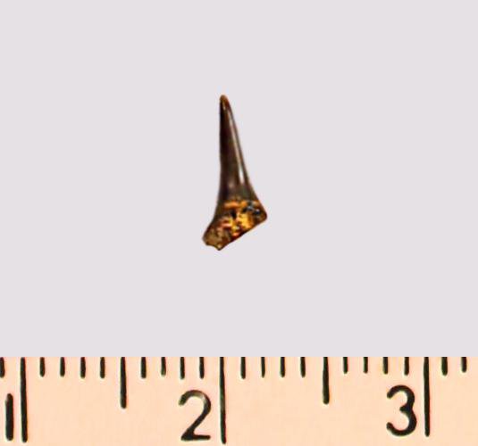 Зуб (фрагмент). Акула. Eostriatolamia subulata (Agassiz, 1843). Классификация: Хордовые Chordata, Позвоночные Vertebrata, Хрящевые рыбы Chondrichthyes, Пластиножаберные Elasmobranchii