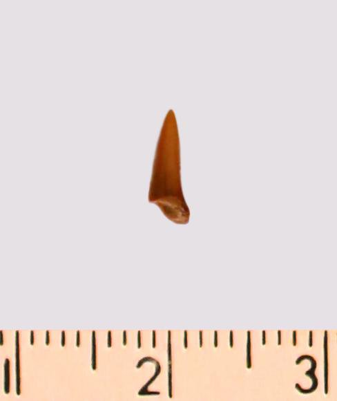 Зуб (фрагмент). Акула. Odontaspis striatula Dalinkevicius, 1935. Классификация: Хордовые Chordata, Позвоночные Vertebrata, Хрящевые рыбы Chondrichthyes, Пластиножаберные Elasmobranchii