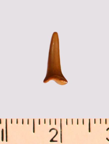 Зуб (фрагмент). Акула. Odontaspis striatula Dalinkevicius, 1935. Классификация: Хордовые Chordata, Позвоночные Vertebrata, Хрящевые рыбы Chondrichthyes, Пластиножаберные Elasmobranchii