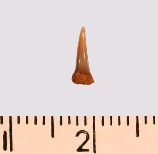 Зуб (фрагмент). Акула. Odontaspis striatula Dalinkevicius, 1935. Классификация: Хордовые Chordata, Позвоночные Vertebrata, Хрящевые рыбы Chondrichthyes, Пластиножаберные Elasmobranchii