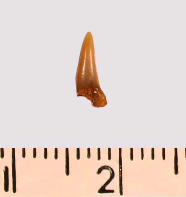 Зуб (фрагмент). Акула. Odontaspis striatula Dalinkevicius, 1935. Классификация: Хордовые Chordata, Позвоночные Vertebrata, Хрящевые рыбы Chondrichthyes, Пластиножаберные Elasmobranchii
