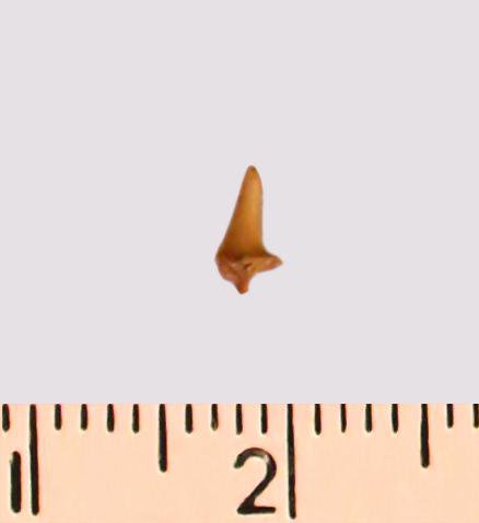 Зуб (фрагмент). Акула. Odontaspis striatula Dalinkevicius, 1935. Классификация: Хордовые Chordata, Позвоночные Vertebrata, Хрящевые рыбы Chondrichthyes, Пластиножаберные Elasmobranchii
