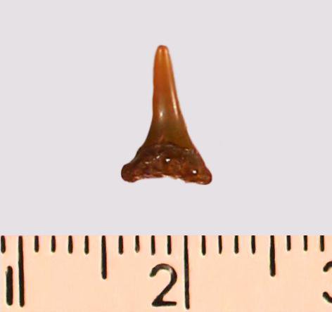 Зуб (фрагмент). Акула. Odontaspis striatula Dalinkevicius, 1935. Классификация: Хордовые Chordata, Позвоночные Vertebrata, Хрящевые рыбы Chondrichthyes, Пластиножаберные Elasmobranchii
