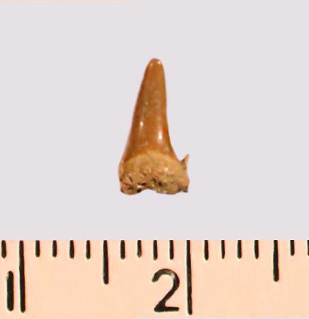 Зуб (фрагмент). Акула. Odontaspis striatula Dalinkevicius, 1935. Классификация: Хордовые Chordata, Позвоночные Vertebrata, Хрящевые рыбы Chondrichthyes, Пластиножаберные Elasmobranchii