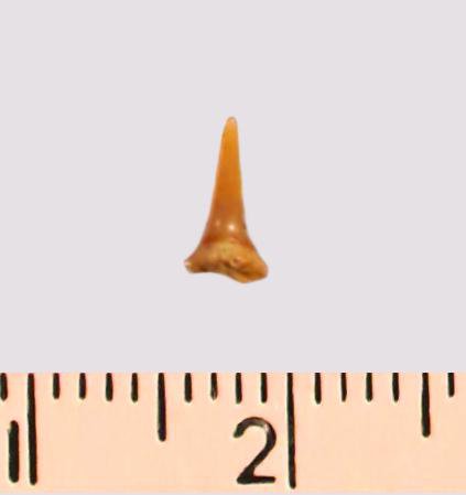 Зуб (фрагмент). Акула. Odontaspis striatula Dalinkevicius, 1935. Классификация: Хордовые Chordata, Позвоночные Vertebrata, Хрящевые рыбы Chondrichthyes, Пластиножаберные Elasmobranchii