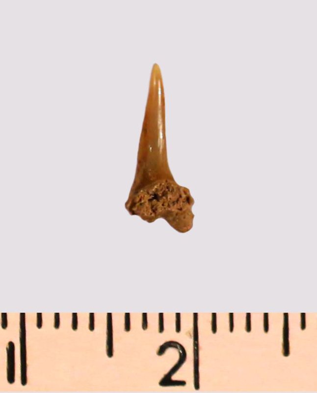 Зуб. Акула. Odontaspis striatula Dalinkevicius, 1935. Классификация: Хордовые Chordata, Позвоночные Vertebrata, Хрящевые рыбы Chondrichthyes, Пластиножаберные Elasmobranchii