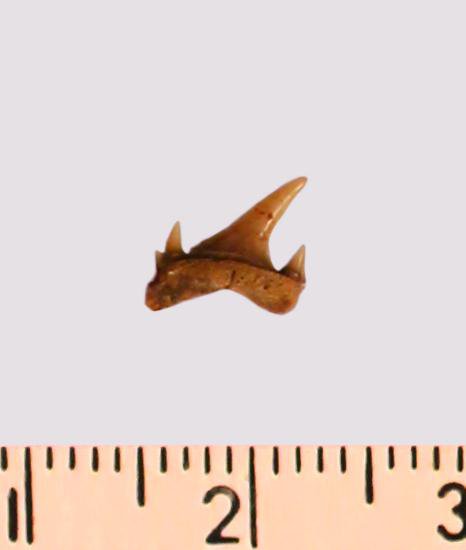 Зуб. Акула. Odontaspis striatula Dalinkevicius, 1935. Классификация: Хордовые Chordata, Позвоночные Vertebrata, Хрящевые рыбы Chondrichthyes, Пластиножаберные Elasmobranchii