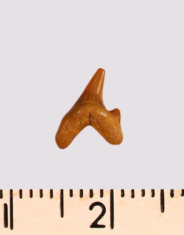Зуб. Акула. Odontaspis macrorhiza (Cope) Leriche, 1902. Классификация: Хордовые Chordata, Позвоночные Vertebrata, Хрящевые рыбы Chondrichthyes, Пластиножаберные Elasmobranchii
