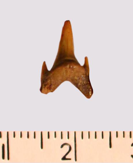 Зуб. Акула. Odontaspis macrorhiza (Cope) Leriche, 1902. Классификация: Хордовые Chordata, Позвоночные Vertebrata, Хрящевые рыбы Chondrichthyes, Пластиножаберные Elasmobranchii