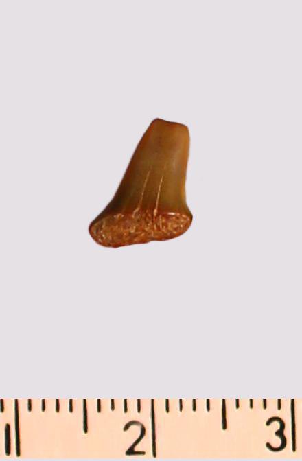 Зуб (фрагмент). Акула. Scapanorhynchus gigas Woodward, 1889. Классификация: Хордовые Chordata, Позвоночные Vertebrata, Хрящевые рыбы Chondrichthyes, Пластиножаберные Elasmobranchii