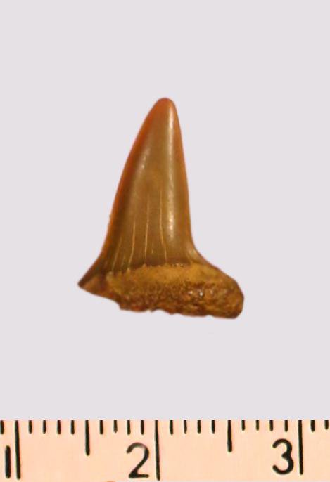 Зуб (фрагмент). Акула. Scapanorhynchus gigas Woodward, 1889. Классификация: Хордовые Chordata, Позвоночные Vertebrata, Хрящевые рыбы Chondrichthyes, Пластиножаберные Elasmobranchii
