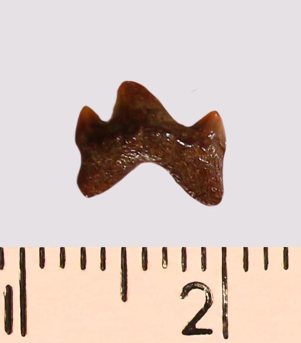 Зуб (фрагмент). Акула. Odontaspis macrorhiza (Cope) Leriche, 1902. Классификация: Хордовые Chordata, Позвоночные Vertebrata, Хрящевые рыбы Chondrichthyes, Пластиножаберные Elasmobranchii