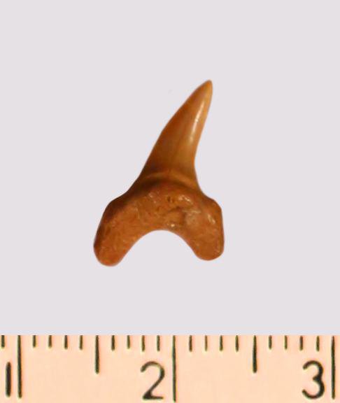 Зуб (фрагмент). Акула. Odontaspis macrorhiza (Cope) Leriche, 1902. Классификация: Хордовые Chordata, Позвоночные Vertebrata, Хрящевые рыбы Chondrichthyes, Пластиножаберные Elasmobranchii