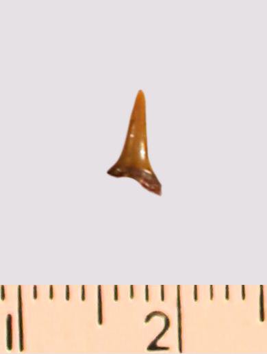 Зуб (фрагмент). Акула. Odontaspis striatula Dalinkevicius, 1935. Классификация: Хордовые Chordata, Позвоночные Vertebrata, Хрящевые рыбы Chondrichthyes, Пластиножаберные Elasmobranchii