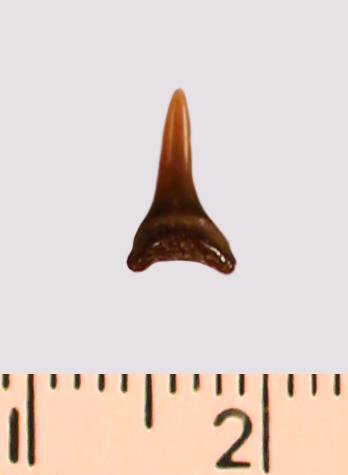 Зуб. Акула. Odontaspis striatula Dalinkevicius, 1935. Классификация: Хордовые Chordata, Позвоночные Vertebrata, Хрящевые рыбы Chondrichthyes, Пластиножаберные Elasmobranchii