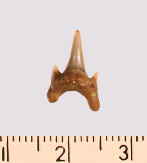 Зуб. Акула. Odontaspis macrorhiza (Cope) Leriche, 1902. Классификация: Хордовые Chordata, Позвоночные Vertebrata, Хрящевые рыбы Chondrichthyes, Пластиножаберные Elasmobranchii