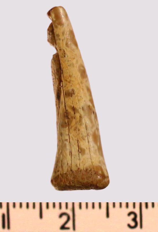 Зуб (фрагмент). Акула. Scapanorhynchus gigas Woodward 1889. Классификация: Хордовые Chordata, Позвоночные Vertebrata, Хрящевые рыбы Chondrichthyes, Пластиножаберные Elasmobranchii