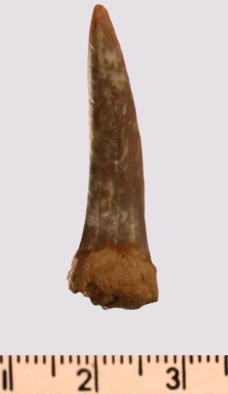 Зуб (фрагмент). Акула. Scapanorhynchus gigas Woodward 1889. Классификация: Хордовые Chordata, Позвоночные Vertebrata, Хрящевые рыбы Chondrichthyes, Пластиножаберные Elasmobranchii