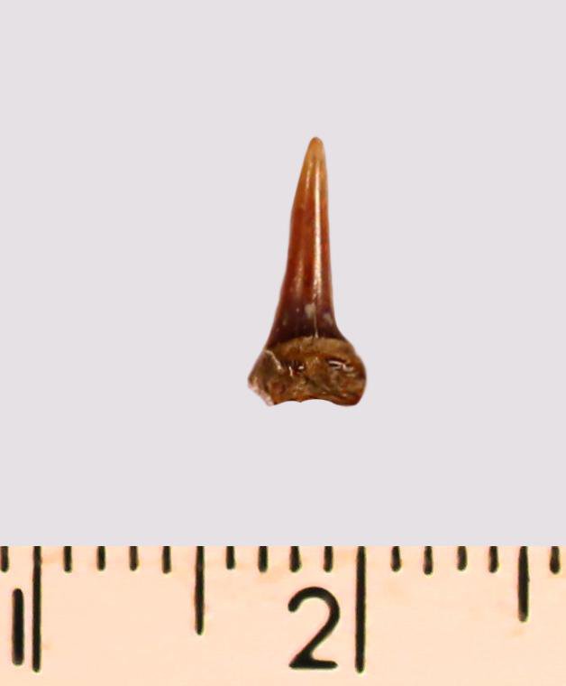 Зуб (фрагмент). Акула. Eostriatolamia subulata (Agassiz, 1843). Классификация: Хордовые Chordata, Позвоночные Vertebrata, Хрящевые рыбы Chondrichthyes, Пластиножаберные Elasmobranchii