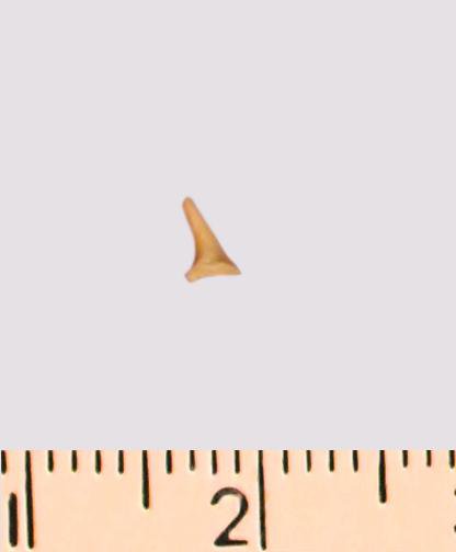 Зуб (фрагмент). Акула. Eostriatolamia gracilis (Davis, 1890). Классификация: Хордовые Chordata, Позвоночные Vertebrata, Хрящевые рыбы Chondrichthyes, Пластиножаберные Elasmobranchii