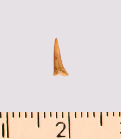 Зуб (фрагмент). Акула. Eostriatolamia gracilis (Davis, 1890). Классификация: Хордовые Chordata, Позвоночные Vertebrata, Хрящевые рыбы Chondrichthyes, Пластиножаберные Elasmobranchii