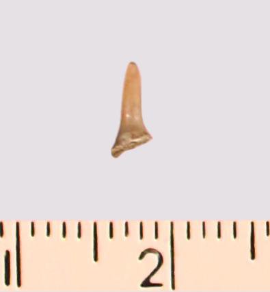 Зуб (фрагмент). Акула. Eostriatolamia gracilis (Davis, 1890). Классификация: Хордовые Chordata, Позвоночные Vertebrata, Хрящевые рыбы Chondrichthyes, Пластиножаберные Elasmobranchii