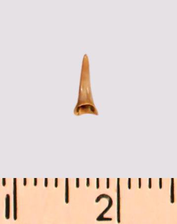 Зуб (фрагмент). Акула. Eostriatolamia gracilis (Davis, 1890). Классификация: Хордовые Chordata, Позвоночные Vertebrata, Хрящевые рыбы Chondrichthyes, Пластиножаберные Elasmobranchii
