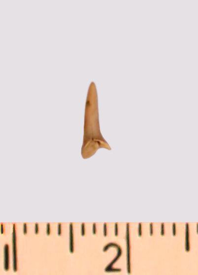 Зуб (фрагмент). Акула. Eostriatolamia gracilis (Davis, 1890). Классификация: Хордовые Chordata, Позвоночные Vertebrata, Хрящевые рыбы Chondrichthyes, Пластиножаберные Elasmobranchii