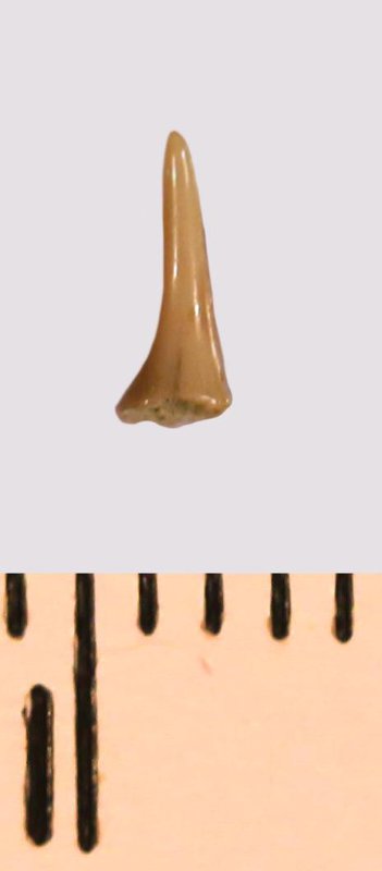 Зуб (фрагмент). Акула. Eostriatolamia gracilis (Davis, 1890). Классификация: Хордовые Chordata, Позвоночные Vertebrata, Хрящевые рыбы Chondrichthyes, Пластиножаберные Elasmobranchii