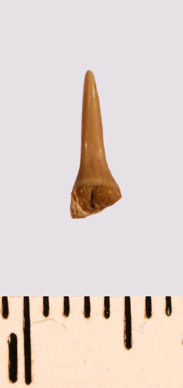Зуб (фрагмент). Акула. Eostriatolamia gracilis (Davis, 1890). Классификация: Хордовые Chordata, Позвоночные Vertebrata, Хрящевые рыбы Chondrichthyes, Пластиножаберные Elasmobranchii