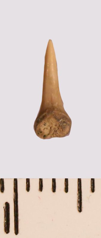 Зуб (фрагмент). Акула. Eostriatolamia gracilis (Davis, 1890). Классификация: Хордовые Chordata, Позвоночные Vertebrata, Хрящевые рыбы Chondrichthyes, Пластиножаберные Elasmobranchii