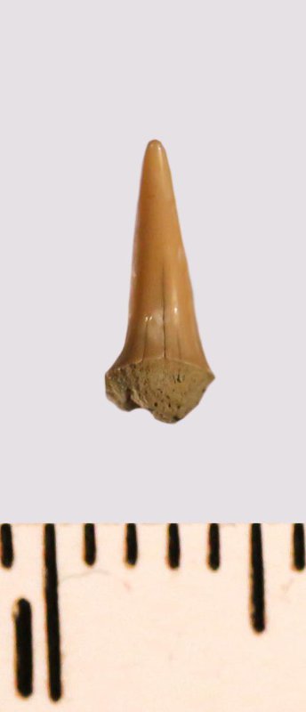 Зуб (фрагмент). Акула. Eostriatolamia gracilis (Davis, 1890). Классификация: Хордовые Chordata, Позвоночные Vertebrata, Хрящевые рыбы Chondrichthyes, Пластиножаберные Elasmobranchii