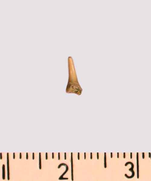 Зуб (фрагмент). Акула. Eostriatolamia gracilis (Davis, 1890). Классификация: Хордовые Chordata, Позвоночные Vertebrata, Хрящевые рыбы Chondrichthyes, Пластиножаберные Elasmobranchii