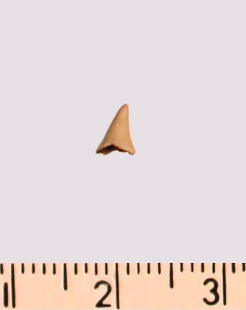 Зуб (фрагмент). Акула. Odontaspis macrorhiza (Cope) Leriche, 1902. Классификация: Хордовые Chordata, Позвоночные Vertebrata, Хрящевые рыбы Chondrichthyes, Пластиножаберные Elasmobranchii