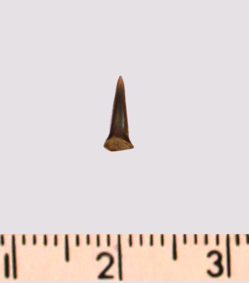Зуб (фрагмент). Акула. Eostriatolamia gracilis (Davis, 1890). Классификация: Хордовые Chordata, Позвоночные Vertebrata, Хрящевые рыбы Chondrichthyes, Пластиножаберные Elasmobranchii